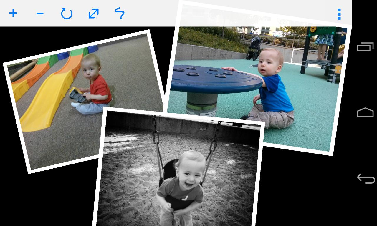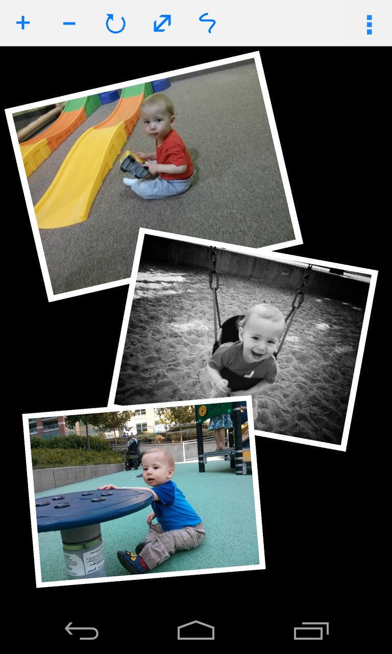 Stack is a smooth multi-touch image collage tool that allows you to easily build great picture collages with minimal effort. It is dead simple with minimal UI to get in the way of your creation. Simply add in images and use gestures to move them around. The remove button (minus) will always remove the last touched image (top of stack). It is tablet and phone friendly and extremely fun. The rotate and expand tool add a layer of precision to aid in your creative process.