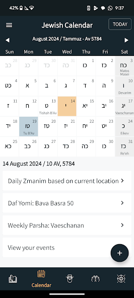 לוח שנה עברי לועזי - כולל זמני היום, דף היומי, והאירועים של אותו יום.