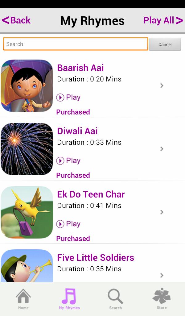 ▪ดาวน์โหลดแอพวันนี้และเล่นหนึ่งใน 5 บทเพลงฟรีของเรา หากคุณต้องการมากขึ้นเพียงแค่ใช้แพ็คเกจสัมผัสที่สร้างขึ้นอย่างสวยงามของเราเพื่อให้เหมาะกับรสนิยมของคุณ ไปที่ 'Rhymes Store' ที่ยอดเยี่ยมของเราภายในแอพเลือกซื้อและดาวน์โหลดชุดสัมผัสใด ๆ ของเราหรือทั้งหมด แพ็คเกจสัมผัสทั้งหมดมีให้บริการผ่านการซื้อแอพใน เรานำเสนอชุดสัมผัสที่มีหลายธีมเช่น: