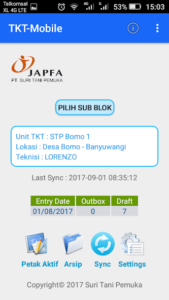 TKT or the Technical Cooperation Team, is a technical staff from PT. Suri Tani Pema (Japfa Group) to help farmers of ponds in producing shrimp or fish farming with the best results. In every work of the TKT team always refers to the basis of the system and procedures that have been determined by the company where the systems and procedures that have been applied have been able to bring satisfying cultivation results in almost all ponds that work together. This application is a tool in monitoring the activities of TKT technical personnel in the field so that everything runs according to the specified system and procedure standards.