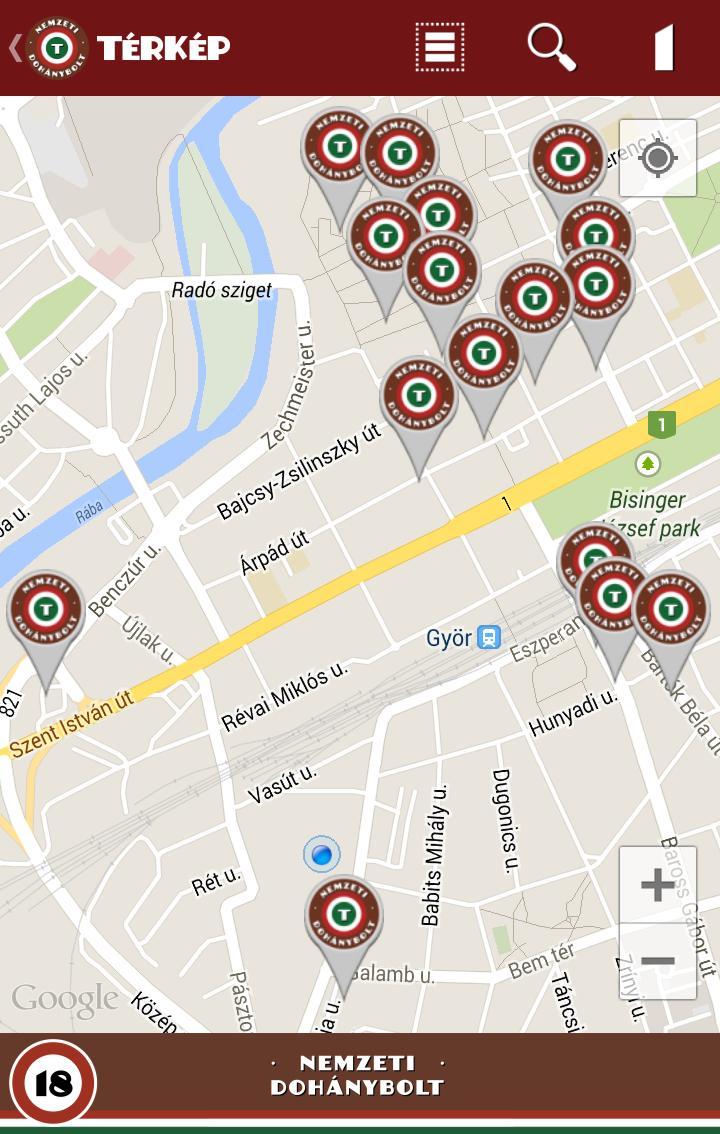 The official national tobacco shop locator application of ND Nemzeti Dohánykereskedelmi Nonprofit Private Limited Company helps the user to find the closest National Tobacco Shop as well as to search according to a number of personal search criteria.