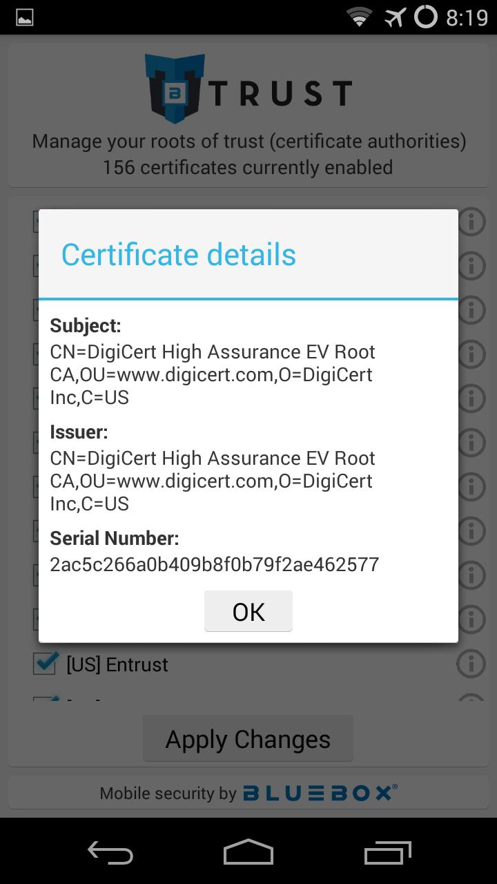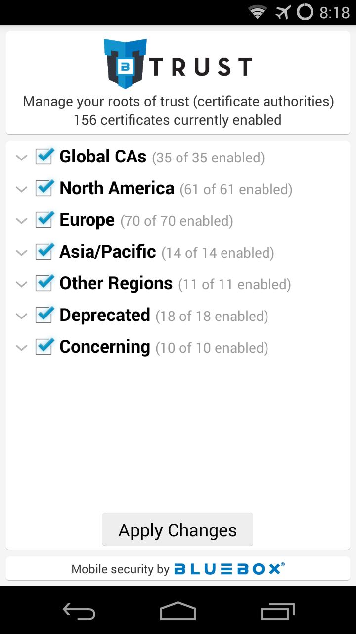 Trust Manager by Bluebox allows users to manage the roots of trust (certificate authorities, or CAs) installed on their Android devices. For more information about the roots of trust on your device: https://bluebox.com/blog/technical/questioning-the-chain-of-trust-investigations-into-the-root-certificates-on-mobile-devices/