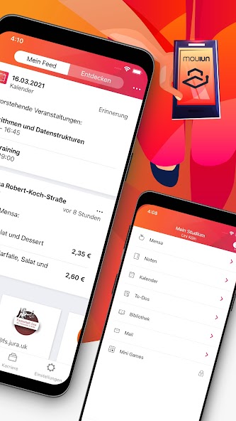 Canteen: Scroll through the menus and find out in the lecture whether it's worth going to the canteen. Or you can mark your favourite canteen and see all the canteen dishes directly on the homepage or as a widget.