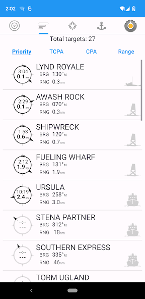 - Instantly acquires target details including cached vessel names.Displays your AIS targets in a list view enabling sorts by priority, CPA, TCPA and range.