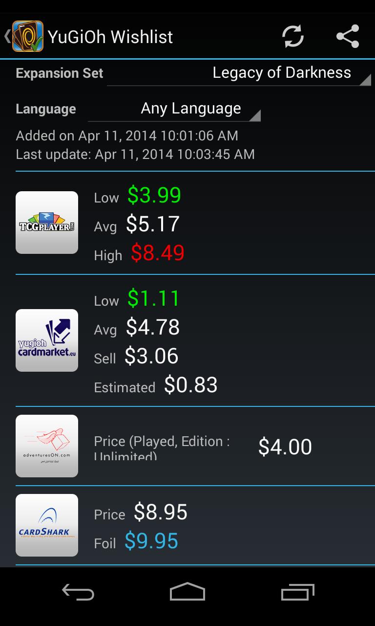 See live card prices for singles directly from webstores such as TCG Player or Yugioh Card Market (it also integrates your Wants and Sells). In addition, you can directly access your favourite cards on some other renowned sites.