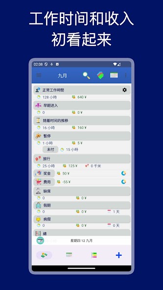 With the calendar inside you can enter, edit and observe the intervals of your working hours for each month by consulting the details divided by hours and earnings: