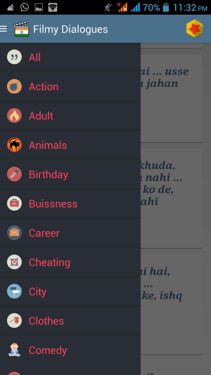 Bollywood Filmy Dialogues - 此应用程序提供了大量印地语电影对话,其中有许多类别,并且涵盖了印度电影的所有最好的电影。