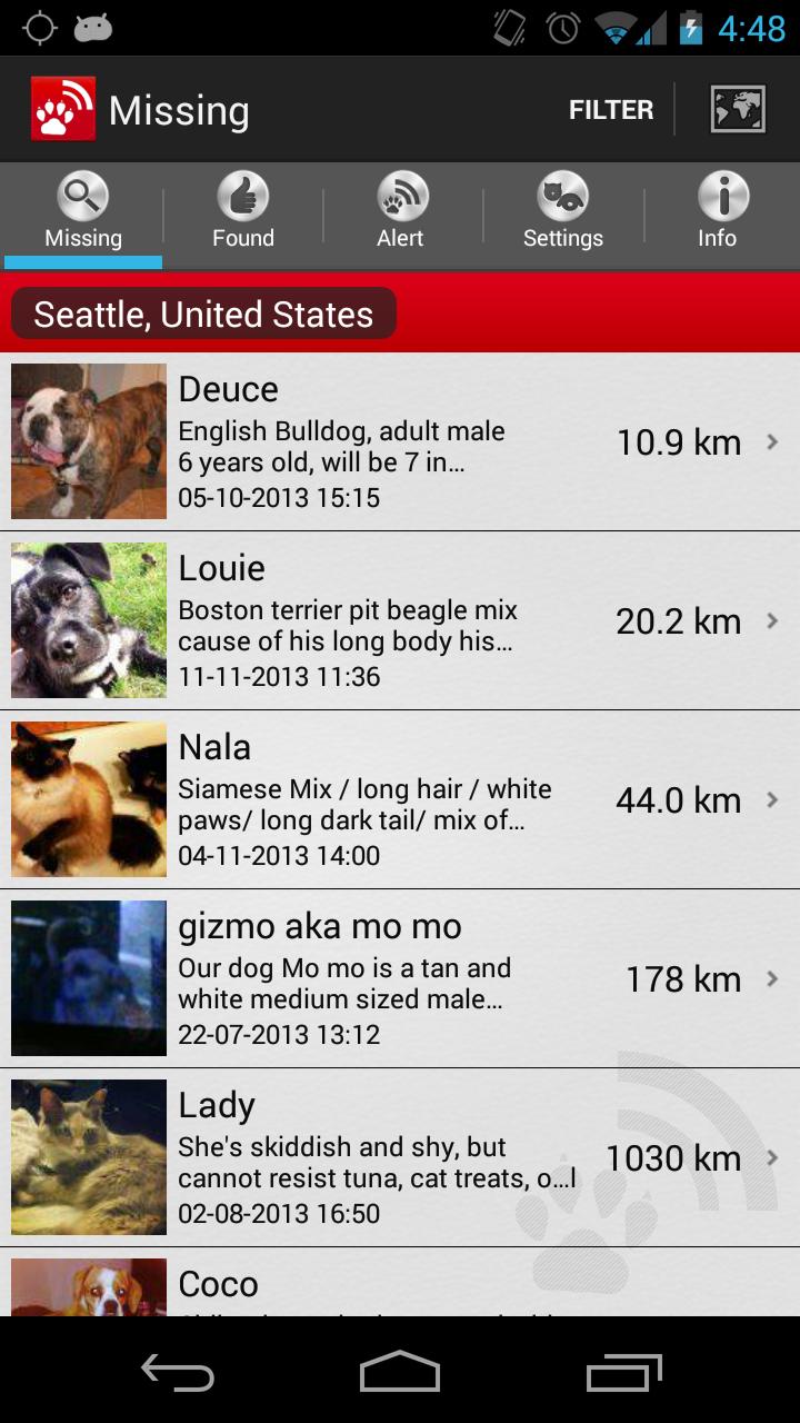 按下按钮发送一个警报,以确保宠物失踪或找到宠物时。在Android手机或Android平板电脑上搜索缺少的宠物以及其他宠物。