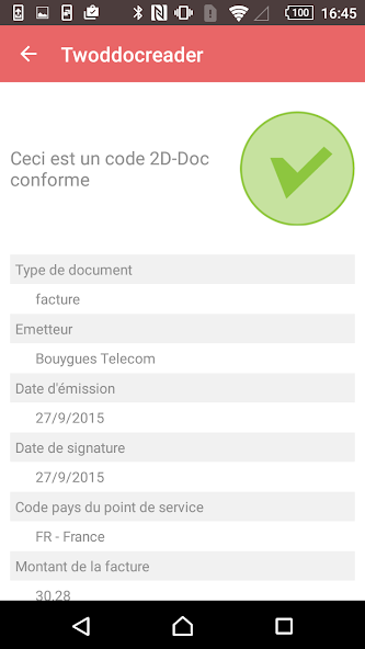 2D-Doc Reader是第一個智能手機應用程序,使人們能夠掃描和檢查2D-DOC條形碼。它只需讀取在文檔上蓋章的任何2D-DOC條形碼,以提取其中包含的信息並將其與文檔中的書面信息進行比較。該應用程序還使用在線服務iCheckit4u檢查了電子簽名和2D-DOC條形碼的發射極,以獲得文檔的有效性證明。