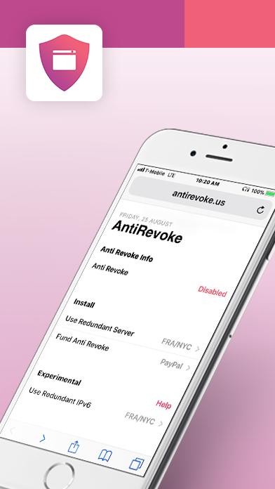 免費免費使用Anti Revoke撤銷Tweakbox和其他酷應用程序的權限。是將VPN安裝到iPhone或iPad上的阻止工具。安裝Anti Revoke後,它將始終在設備打開時工作, Anti Revoke將提供全職保護,以防止嘗試驗證和撤銷應用程序證書。