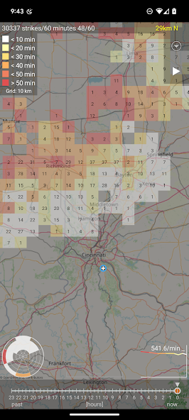 即使存在很高的雷暴活動,柵格顯示也可以確保應用程序的快速性能。 Blitzortung.org參與者可以單獨可視化所有中風位置。