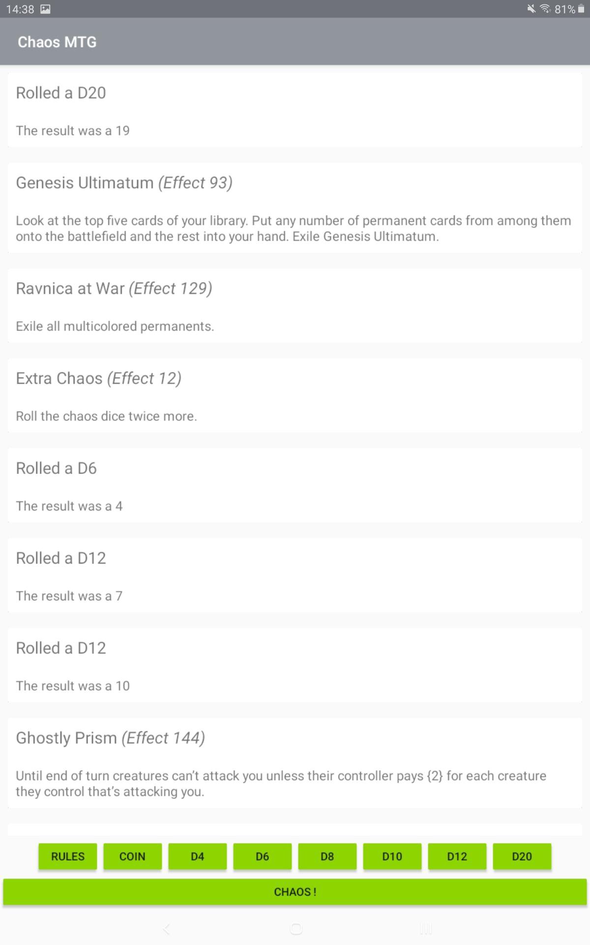 該應用程序提供有趣的多人遊戲體驗。該應用程序具有 147 種獨特效果和擲骰子的功能(D4、D6、D8、D10、D12 和 D20)。其中一些效果考慮了多人模式,例如指揮官,並涉及多個玩家。