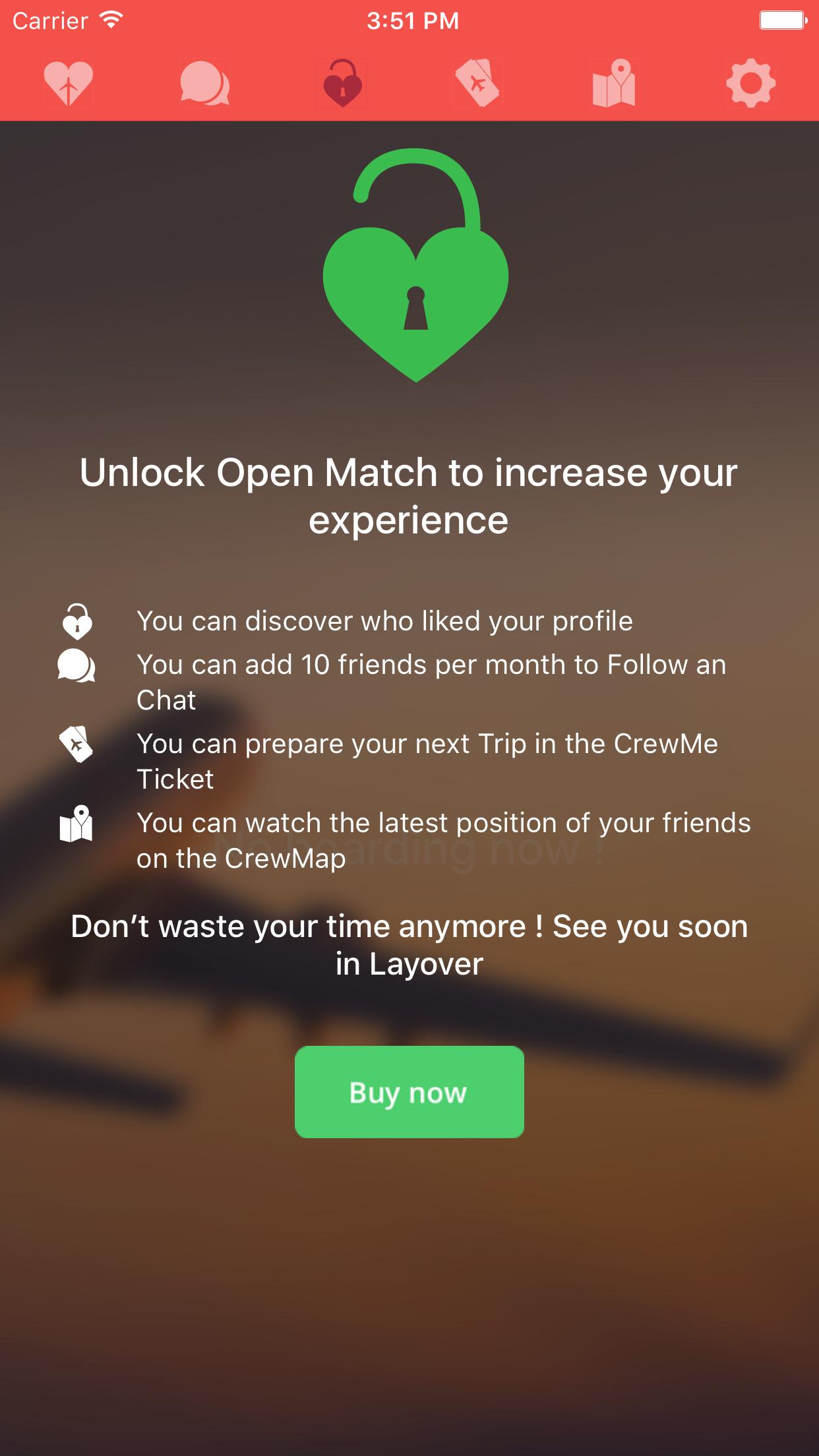 想想更新您的信息(照片,搜索區,搜索,航空公司公司...)。然後享受我們的應用程序!向右滑動,要喜歡或不喜歡!