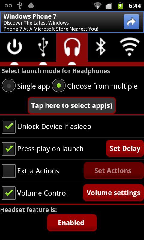 該應用程序是一個真正的“插件”應用。當電源,USB或耳機電纜連接到設備時,它將啟動指定的應用程序(或從多個通過對話框中選擇的功能)。可以包括是/否對話框,因此不會干擾您當前的任務。