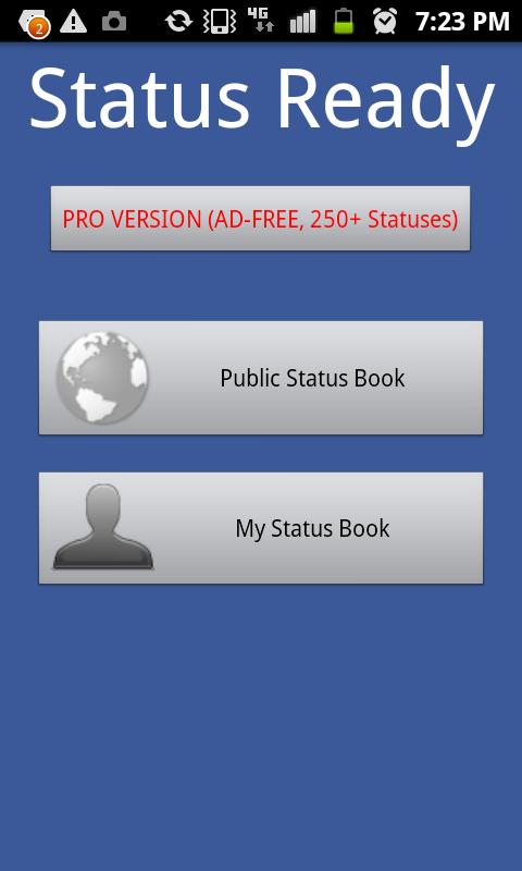 該應用程序分為兩個部分。公共狀態書和我的狀態書。在公共狀態書中,有一些Facebook最好(並且總是乾淨)狀態的列表。我們正在不斷更新此“書”,因此經常回來查看更多狀態。在我的狀態簿中,您可以以“可發布”的格式保存狀態,直到您認為這是適當的時間發布。這使您想記住您提出的狀態,直到您回到服務範圍的問題為止。如果說您只是經歷了分手並感到有義務發布一些戲劇性的東西,而不是您想出的那種有趣的狀態,這也很棒,這也很棒,現在您可以將其保存在我的狀態書中以供以後發布。